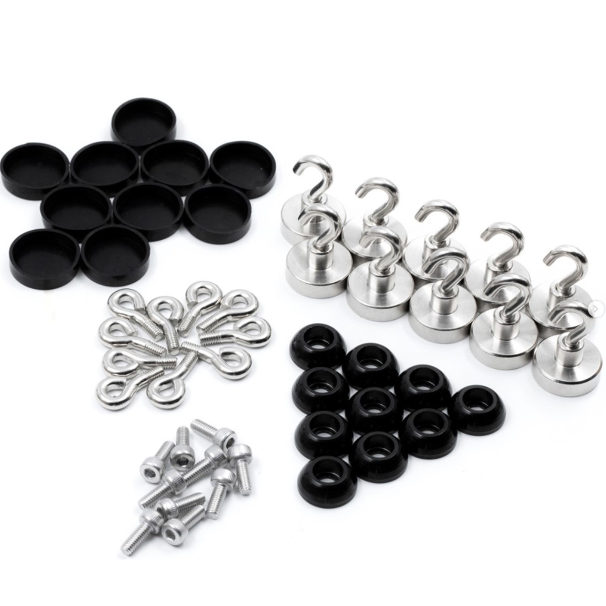 This bundle offers everything you need for the customised use of pot magnets with screw sockets. In addition to 10 pot magnets with screw socket, you also receive matching screw hooks, threaded eyebolts, rubber caps, cylinder-head screws and black washers. The pot magnets, when combined with cylinder screws and washers, form an effective and, at the same time, easy-to-implement hanging option, e.g. for (advertising) signs or coats. In addition, you can pair pot magnets with hooks to hang objects or screw in eyelets to fashion mounting solutions. Perfect for business, home, camping, school, etc.